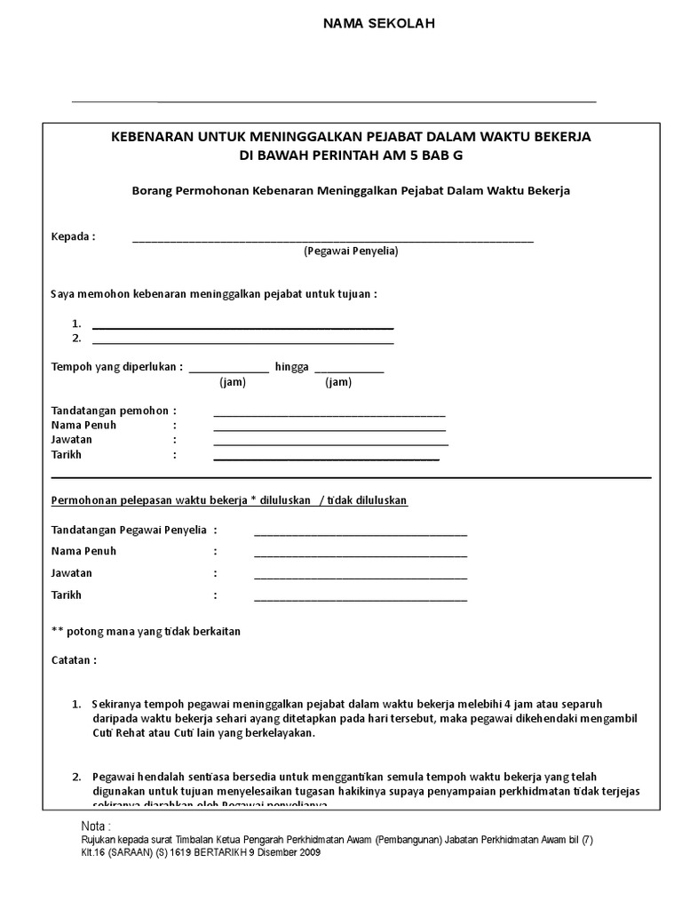 Pastikan anda memberikan alasan yang kukuh untuk. Kebenaran Meninggalkan Pejabat Dalam Waktu Bekerja Kepada. Pelepasan Contoh Surat Rasmi Memohon.